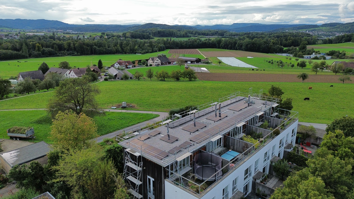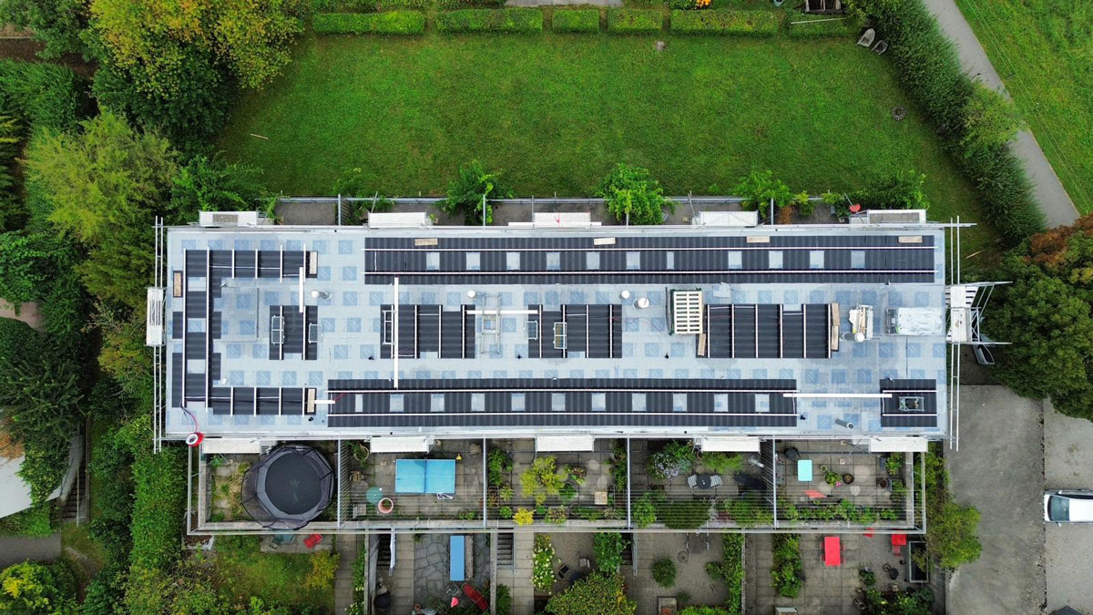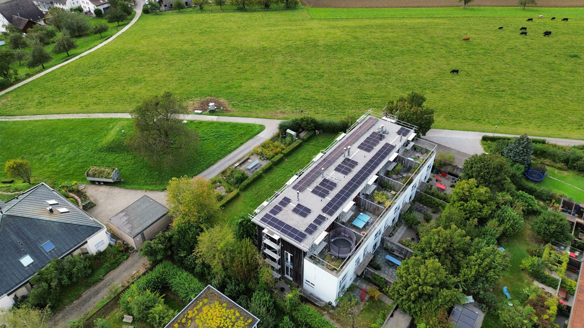 Bei diesem Projekt in Rütihof wurde eine Photovoltaikanlage auf einem Mehrfamilienhaus mit Flachdach realisiert.